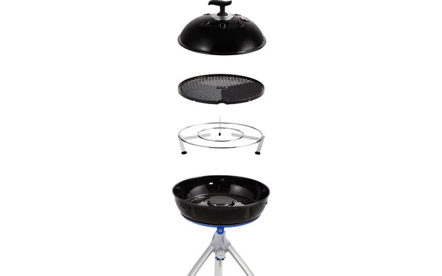 El deflector situado en la parte posterior de la rejilla distribuye el calor de forma ideal. Se incluye un soporte para la olla; todo puede guardarse en una práctica bolsa de transporte.