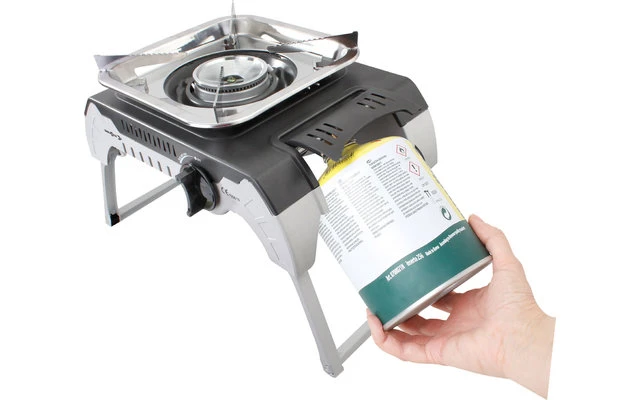 Cocina de gas portátil con patas plegables de acero inoxidable. Funciona con cartuchos roscados de 450 g. Ligero, compacto y fácil de transportar, ideal para acampar o hacer un picnic. Construcción de alta calidad. Incluye un práctico maletín de plástico para su transporte.