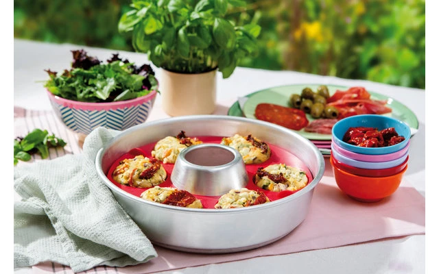 Cada paquete viene con algunas recetas de muestra. Por regla general, no es necesario engrasar el molde de silicona para hornear. El material es seguro para los alimentos, tiene un sabor neutro y es resistente a los ácidos de la fruta. La superficie es fácil de limpiar: el molde es apto para el lavavajillas. Junto con el horno OMNIA, el molde de silicona puede utilizarse en casi todas las cocinas, incluso sobre el fuego. No hay nada que no puedas preparar en los moldes para complacer a tu familia o amigos.