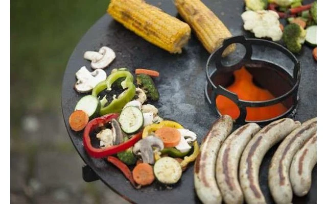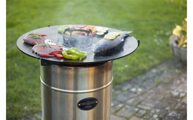 El accesorio de cocción en el centro de la placa sirve de soporte estable para ollas, calderas y jarras. Puedes aprovechar el calor del Pyron para preparar platos completos con tus amigos en la placa de 57 cm de ancho. Incluso con los utensilios de cocina encima, los generosos huecos proporcionan al barril de fuego suficiente oxígeno fresco para mantener el fuego encendido. Además, el orificio en el centro de la parte superior permite rellenar la madera de forma segura durante su uso. Lea atentamente el manual de instrucciones adjunto antes de utilizarlo por primera vez.
