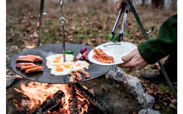 Al igual que cuando se cocina con la parrilla y los cuencos de fuego Petromax, se crean diferentes zonas de cocción que permiten asar filetes en el centro y cocinar suavemente las verduras o mantener la comida caliente en el borde. Con un diámetro de 56 cm, puedes ofrecerte a ti y a tu tropa de forajidos una gran selección de platos diferentes al aire libre.