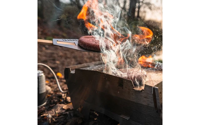 A partir de ahora, podrá girarlo y voltearlo como quiera: el nuevo SKOTTI FLIP es justo lo que necesitaba para la felicidad de su barbacoa. El volteador de alimentos de acero inoxidable es un pequeño pero fino complemento de las pinzas SKOTTI. Para ello, simplemente se enchufa una de las dos espátulas de madera de las pinzas junto con el FLIP – y ya tiene un práctico volteador para hamburguesas, huevos fritos o trozos de verdura y todo lo demás que no se puede agarrar bien con las pinzas.