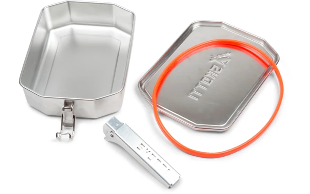Por supuesto, también puede utilizar sus SKOTTI Boks como una alternativa absolutamente robusta, ecológica y duradera a las latas de plástico. Un anillo de sellado de silicona de ajuste preciso evita que los líquidos se filtren, y dos clips de bloqueo especialmente fuertes en los laterales garantizan que el SKOTTI Boks no se abra accidentalmente en su bolso o mochila cuando esté fuera de casa.